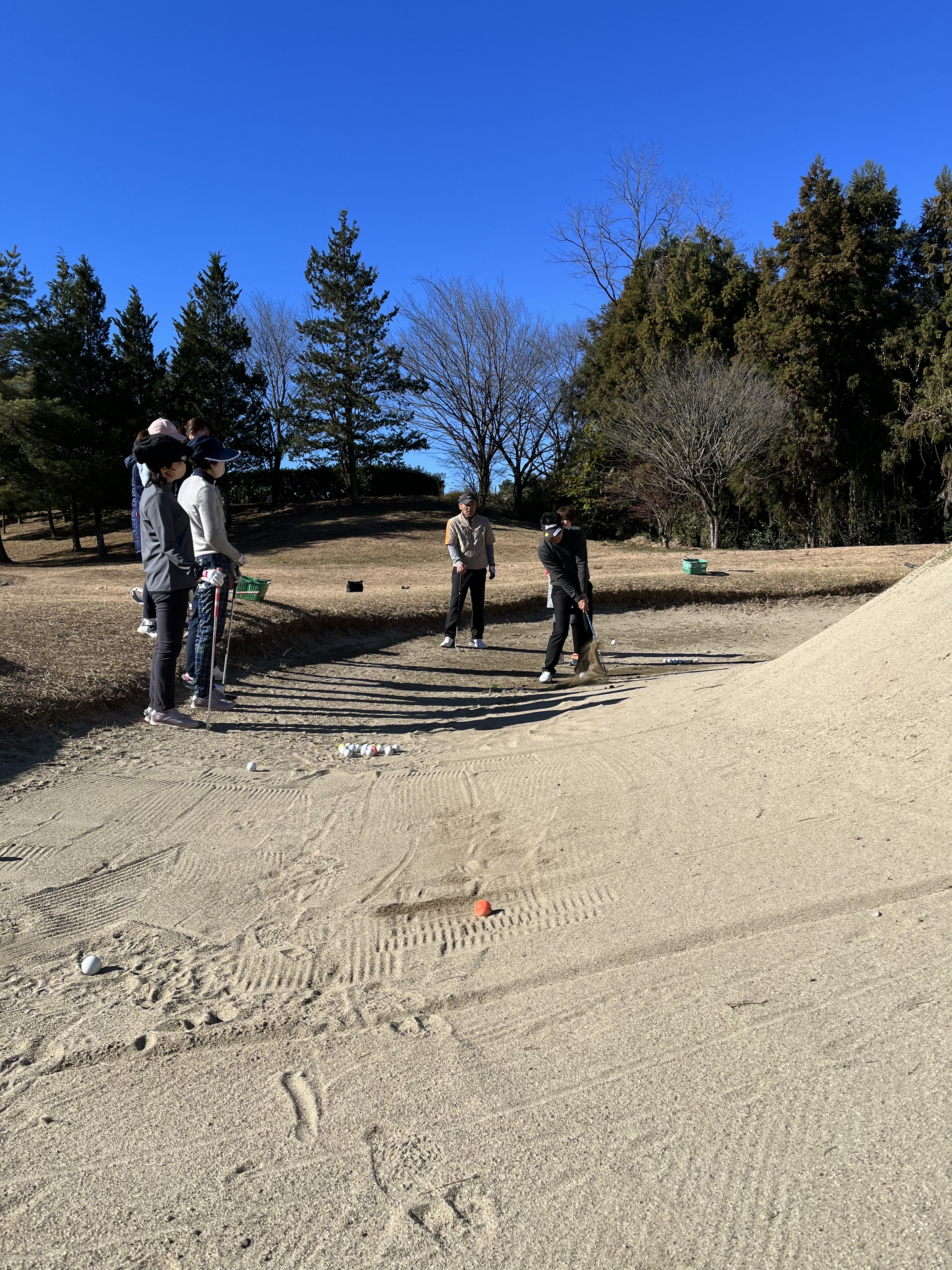 午前の部は同コースのドライビングレンジでショットのレッスン後、隣接するバンカー、アプローチグリーン、